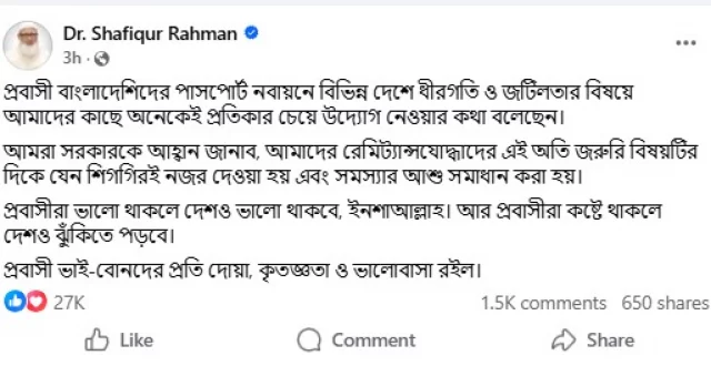 তিনি লিখেন, ‘প্রবাসী বাংলাদেশিদের পাসপোর্ট নবায়নে বিভিন্ন দেশে ধীরগতি ও জটিলতার বিষয়ে আমাদের কাছে অনেকেই প্রতিকার চেয়ে উদ্যোগ নেয়ার কথা বলেছেন। আমরা সরকারকে আহ্বান জানাব, আমাদের রেমিট্যান্সযোদ্ধাদের এই অতি জরুরি বিষয়টির দিকে যেন শিগগিরই নজর দেয়া হয় এবং সমস্যার আশু সমাধান করা হয়।’